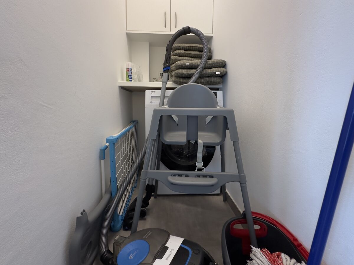 Abstellraum: Waschmaschine, Trockner (Waschtrockner), Wäscheständer, Bügeleisen, Bügelbrett, Staubsauger, Reinigungsmittel