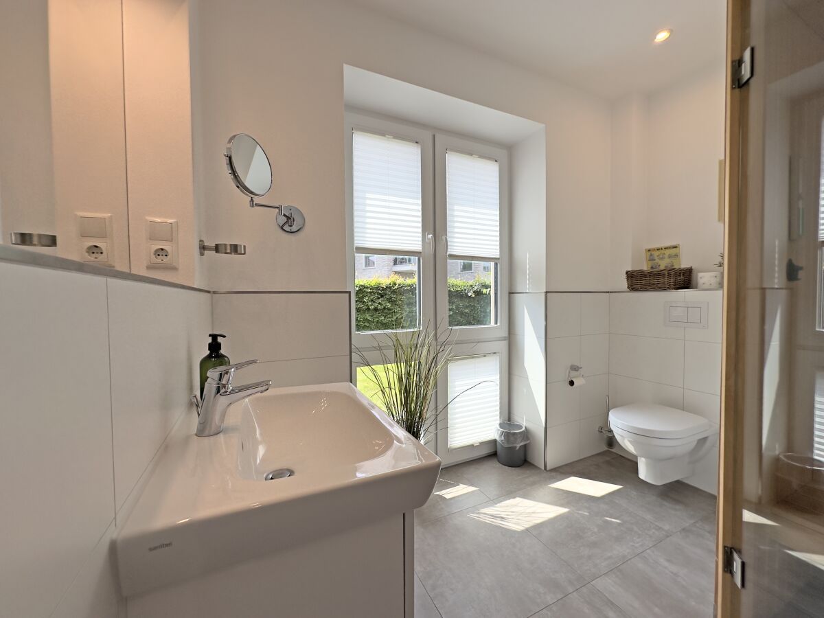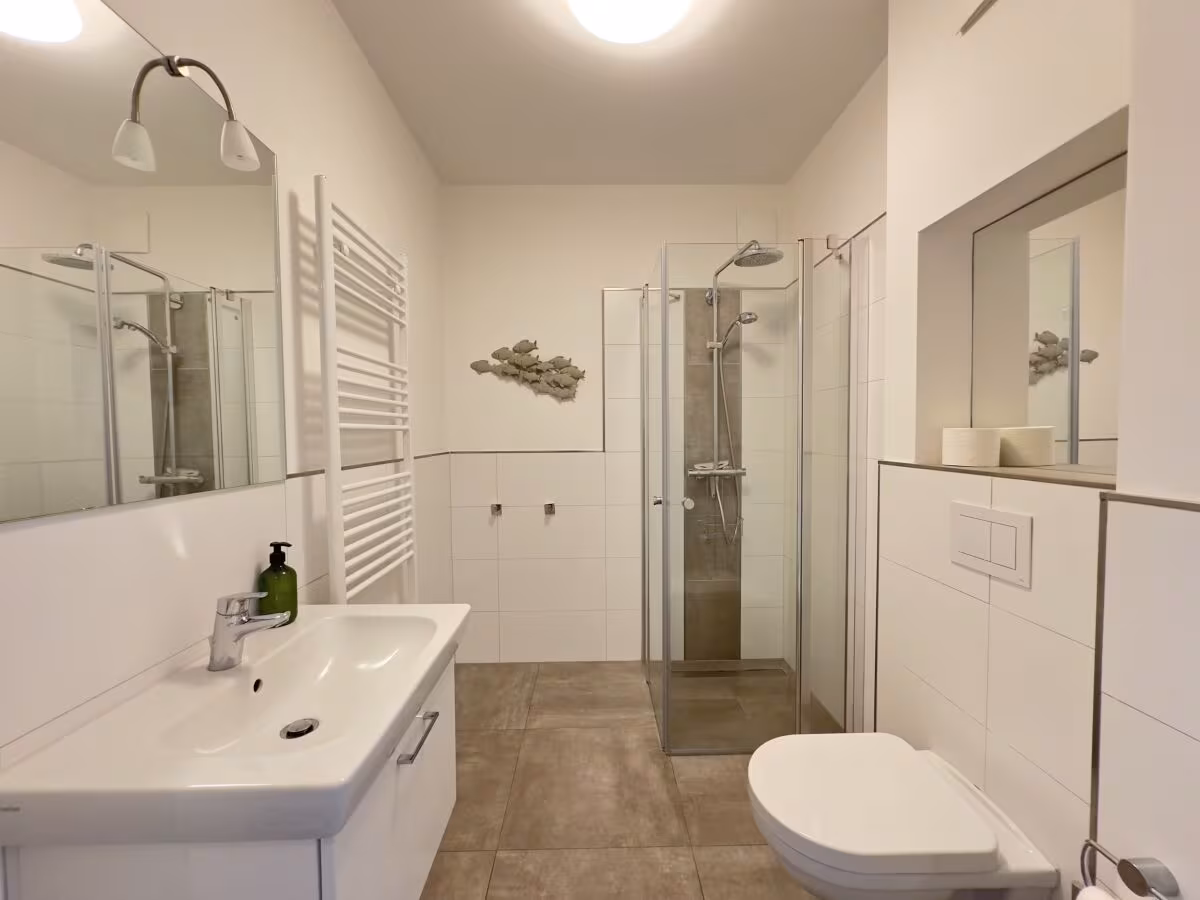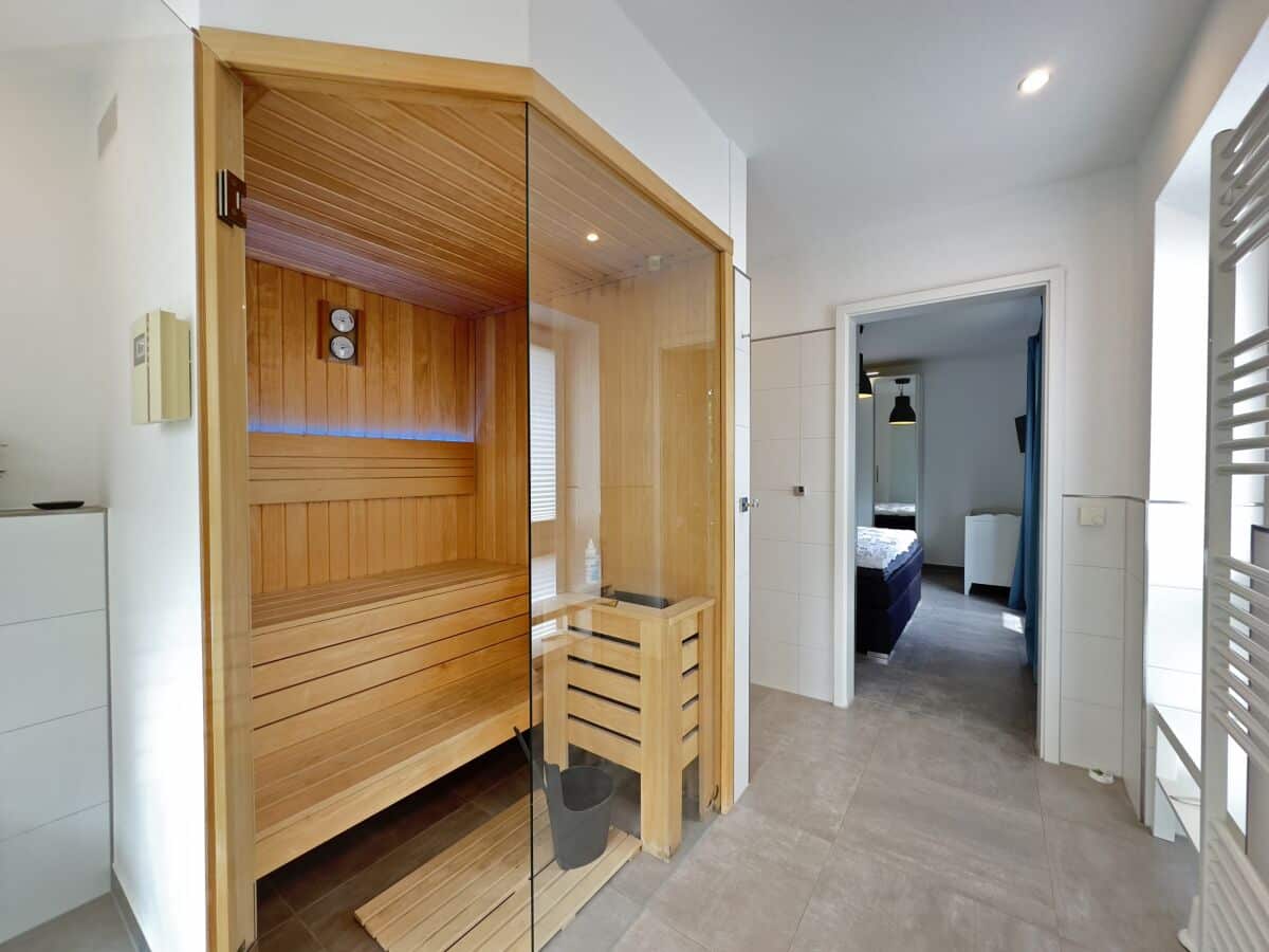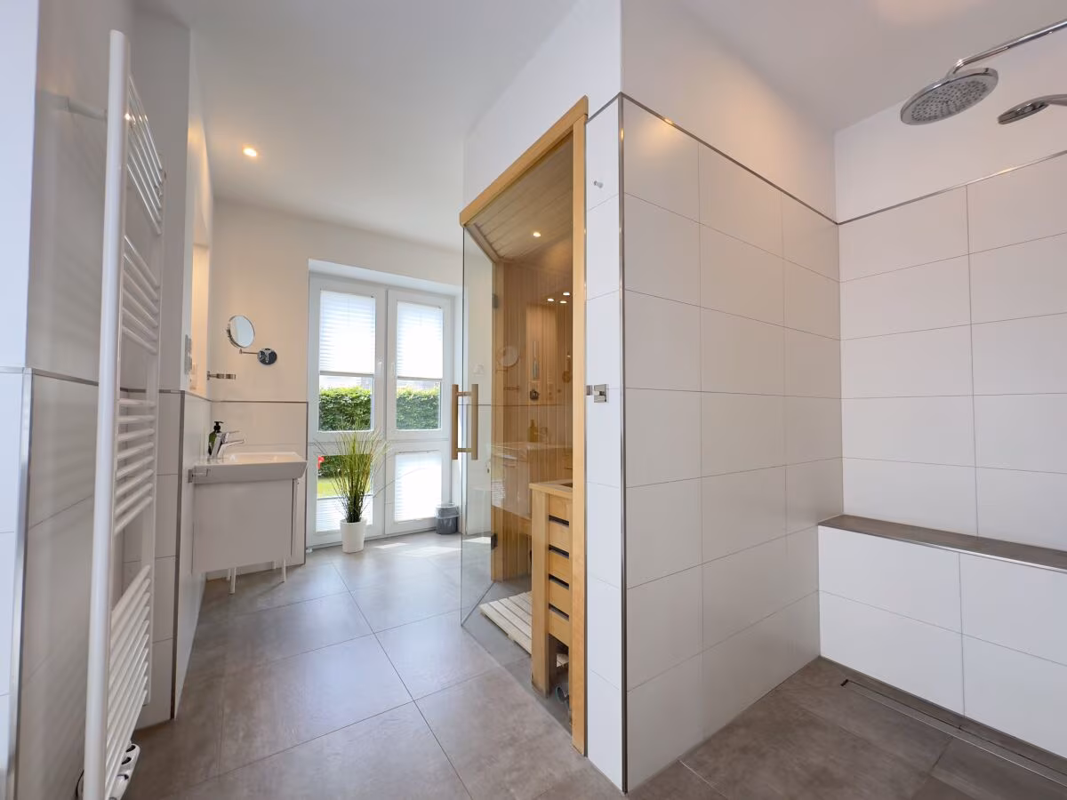 2 Badezimmer: Dusche (bodengleich), Badewanne, private Sauna, Waschbecken, Spiegel, Föhn, Radio, Fußbodenheizung