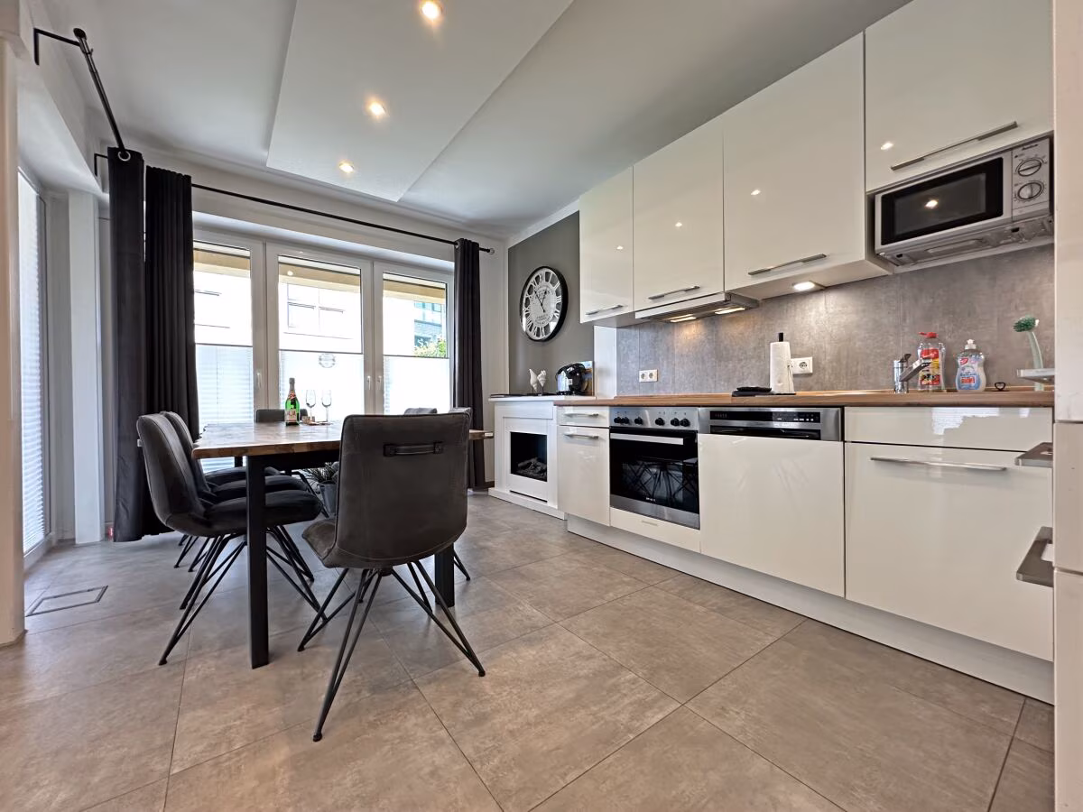 Küche: Küchenzeile, Ceran-Kochfeld/4-Plattenherd, Backofen, Geschirrspüler, Kühlschrank, Gefrierfach, Mikrowelle, Kaffeemaschine, Wasserkocher, Toaster, Eierkocher, Mixer, Geschirr, Gewürze, Steckdosensicherung, Fußbodenheizung