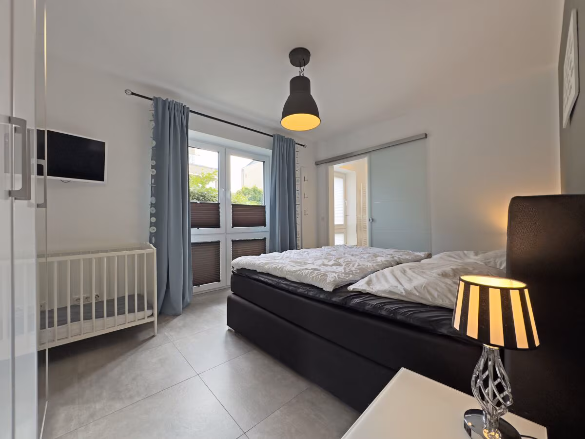 3 Schlafzimmer: 3 Boxspring-Doppelbetten, Babybett, Kleiderschränke, TV SAT/Kabel, Steckdosensicherung, Verdunklung, Fußbodenheizung