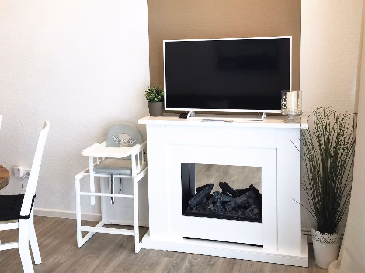 • Wohn-/Schlafzimmer: Leder-Eckgarnitur mit Schlaffunktion (160 cm Kaltschaummatratze), Elektrokamin, Esstisch für 8 Personen, TV SAT/Kabel, DVD-Player, CD-Player, Radio, Spiele, Bücher, Fußbodenheizung