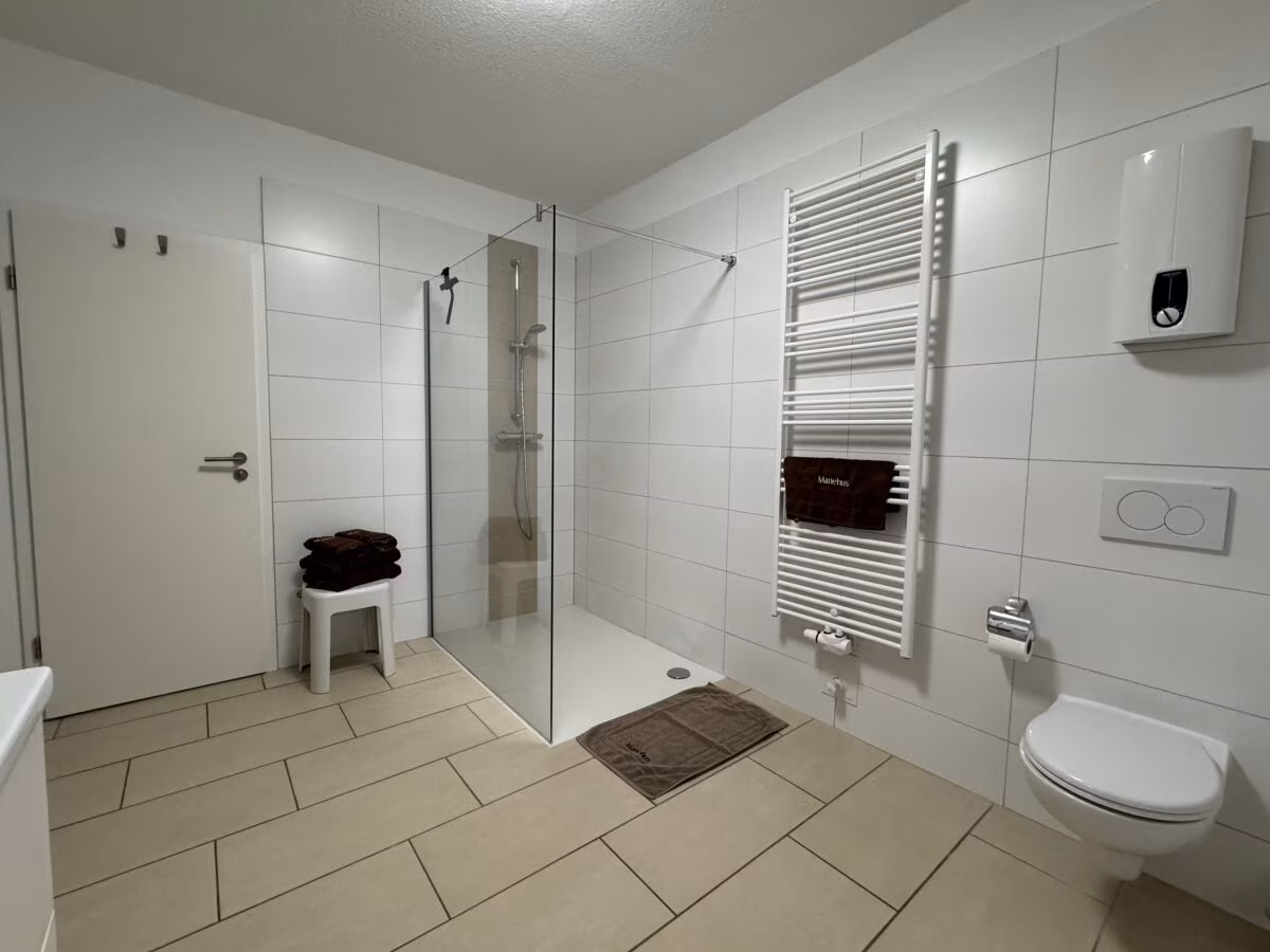 • Badezimmer 1: Dusche, WC, Waschbecken, Spiegel, Fußbodenheizung