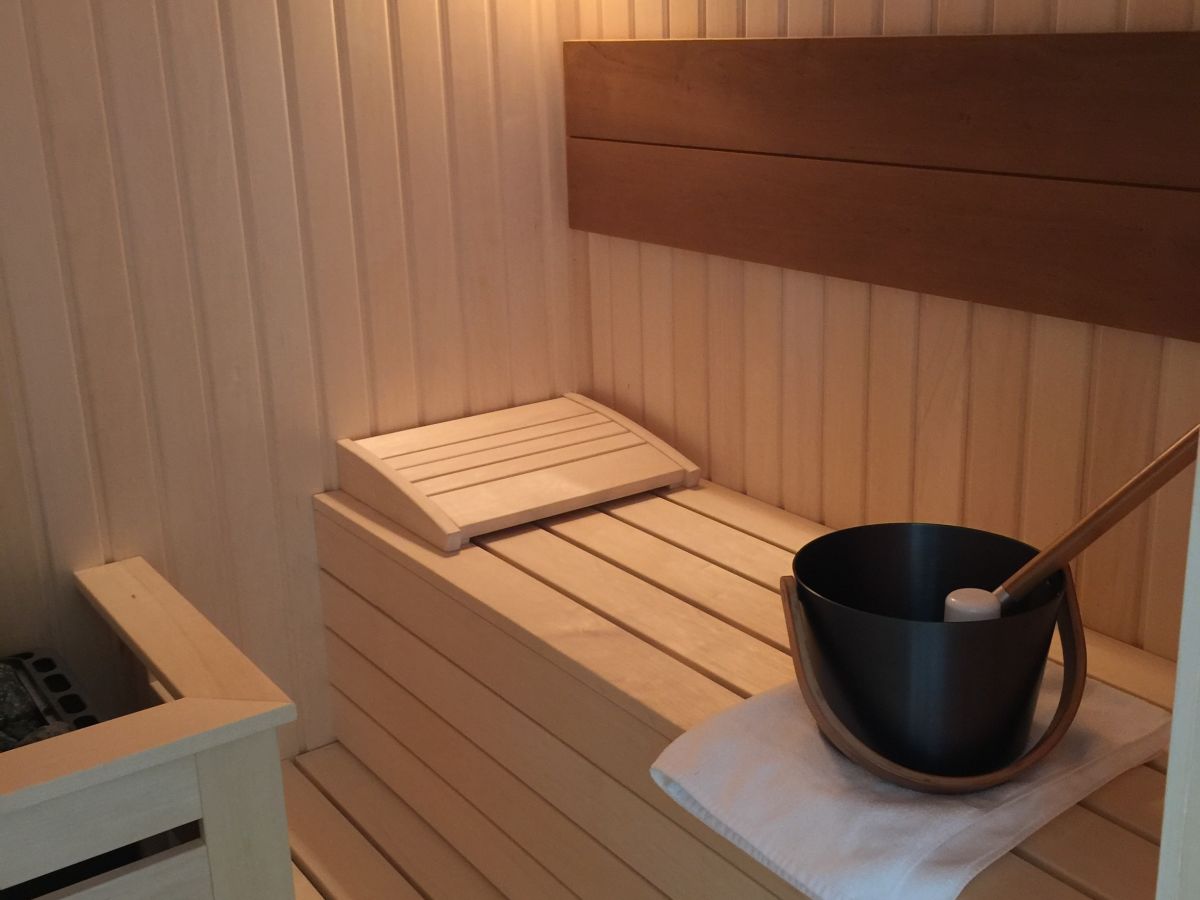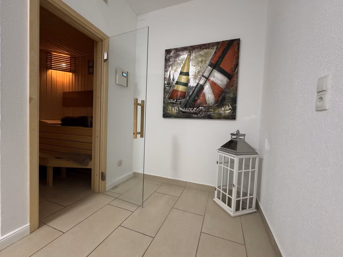 • Badezimmer 2 (Wellness): Große Dusche, Sauna, Doppelwaschbecken, WC, Kindertoilettensitz, Spiegel, Fußbodenheizung